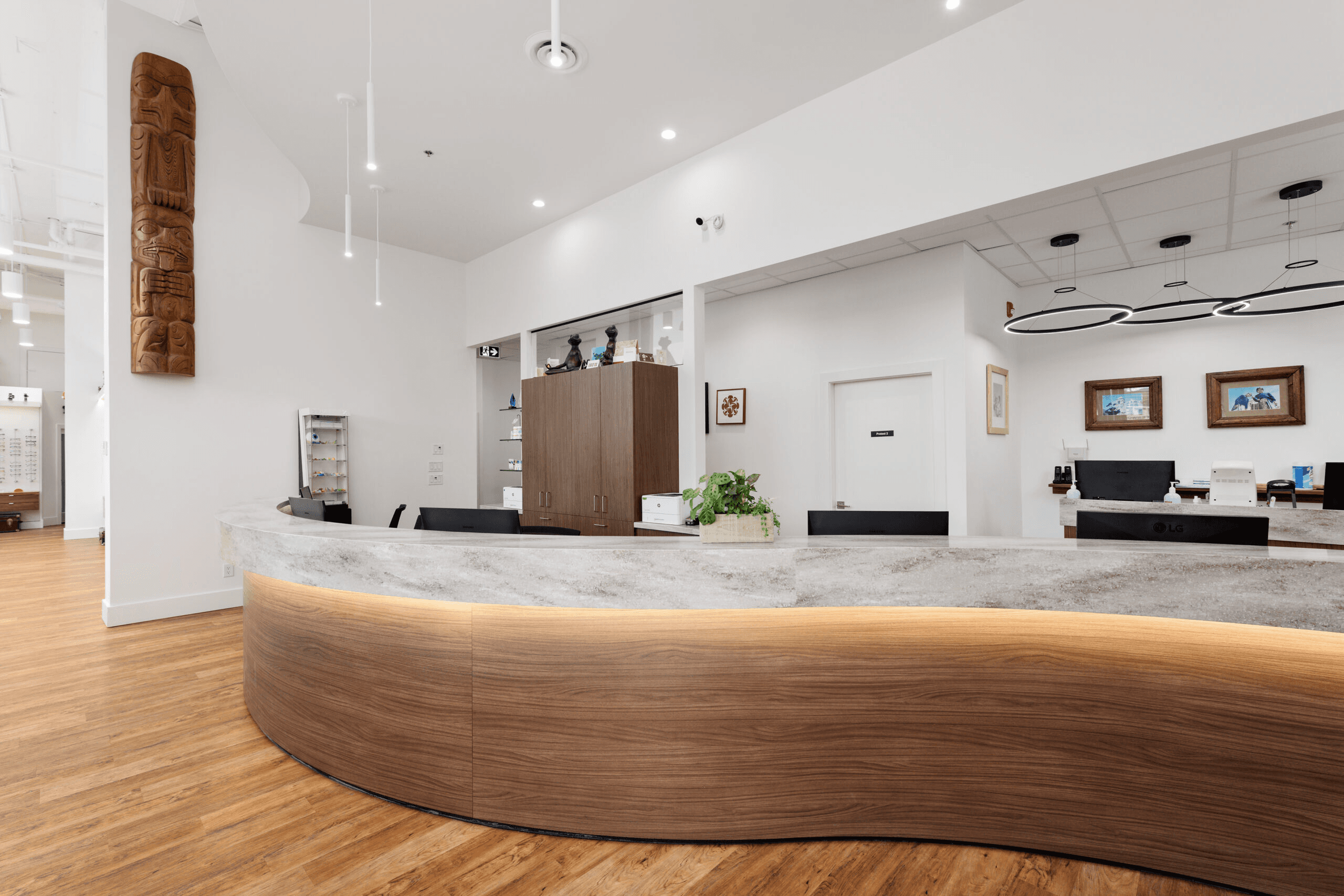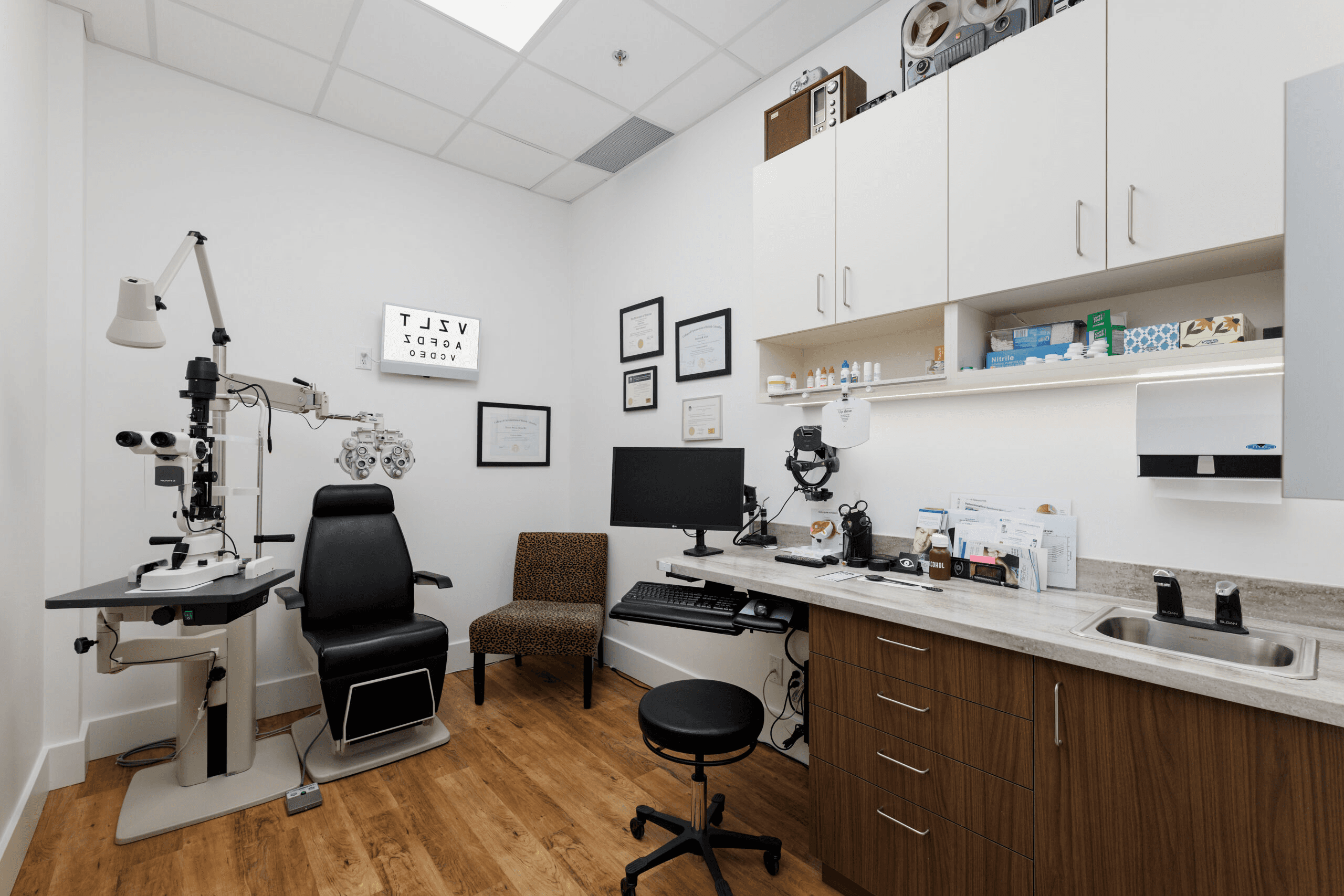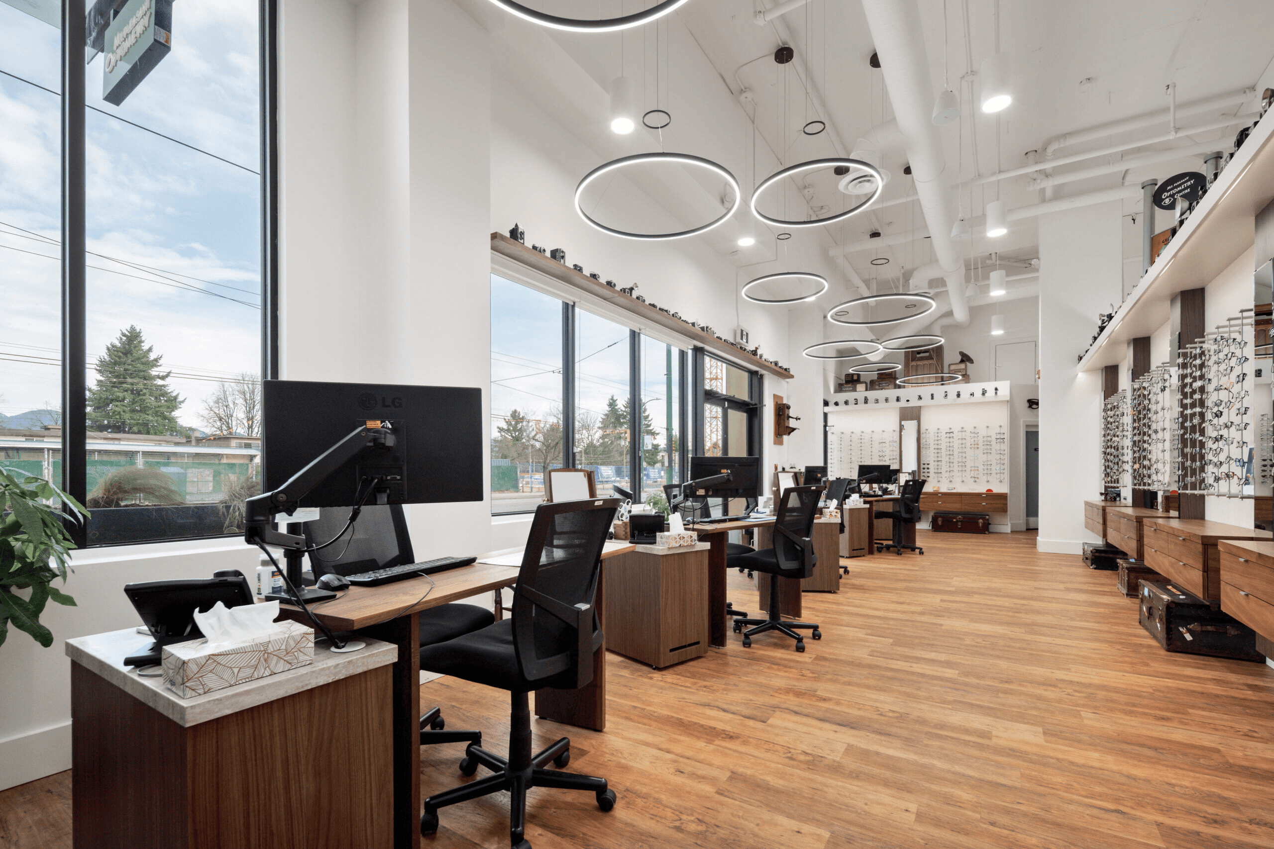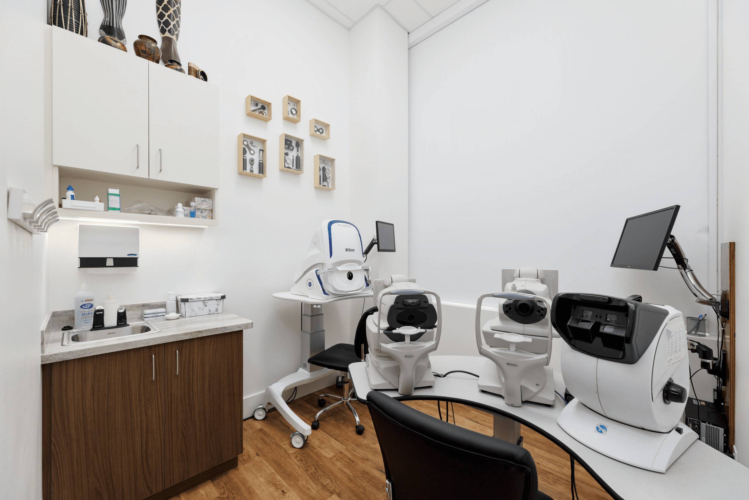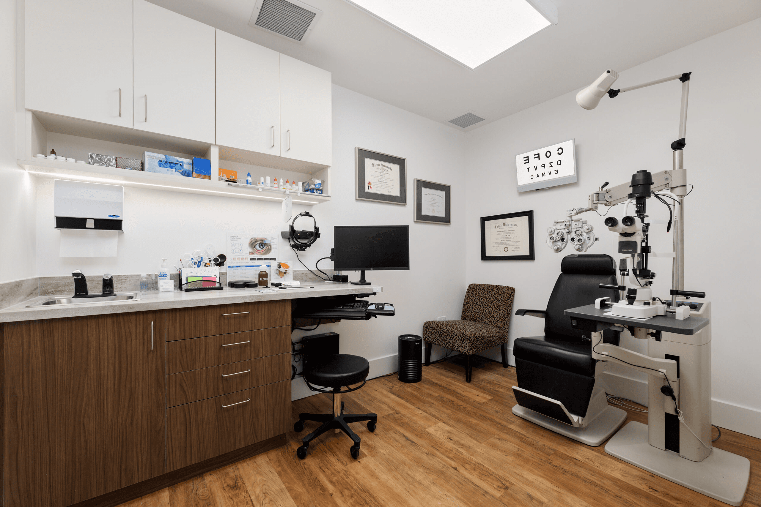 State-of-the-art eye care that’s modern and crisp without feeling cold. The retail eyewear display flows naturally into clinical examination space, creating a seamless patient journey from frame selection to comprehensive eye exam. Clean lines, strategic lighting, and a thoughtful color palette make both products and care stand out.