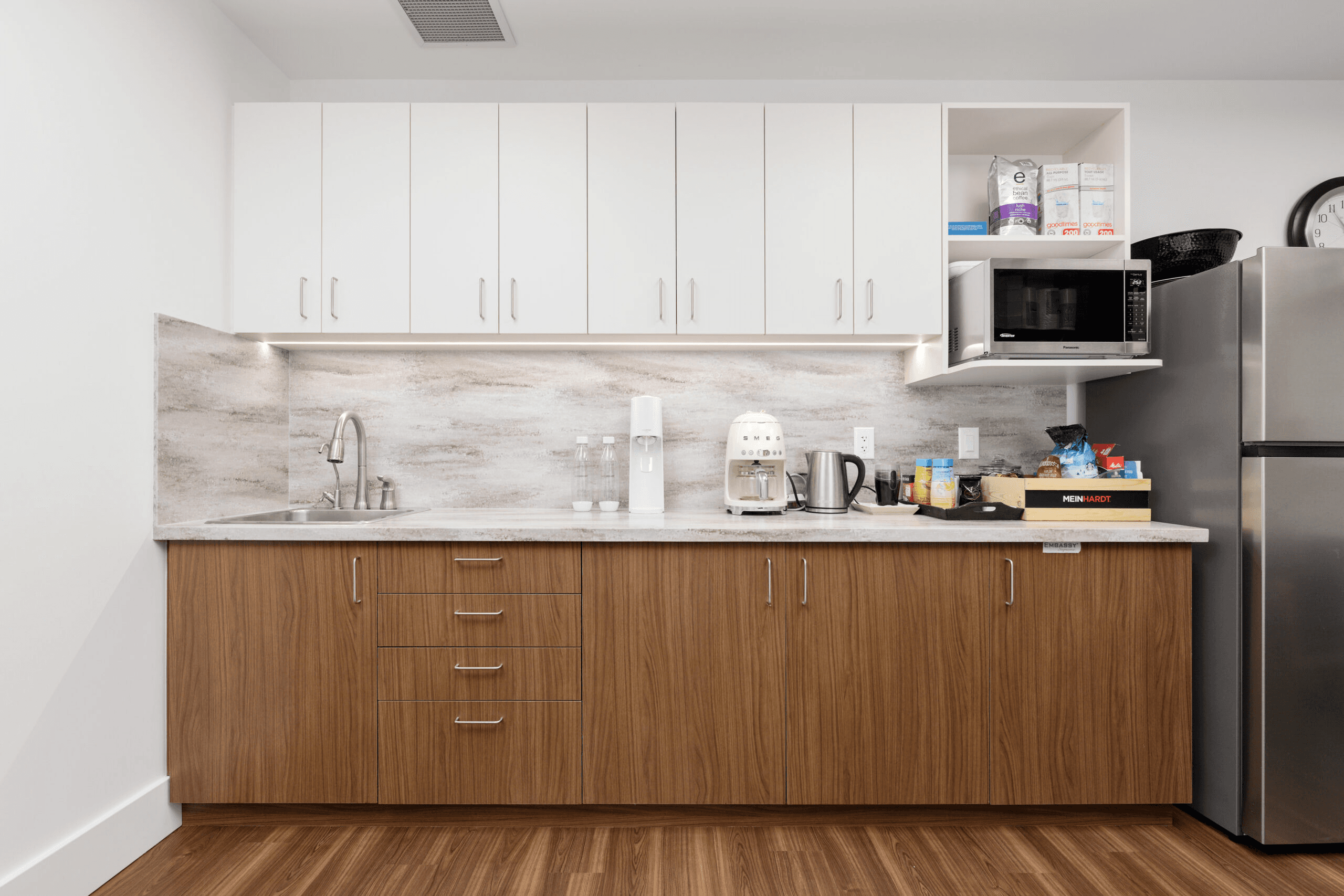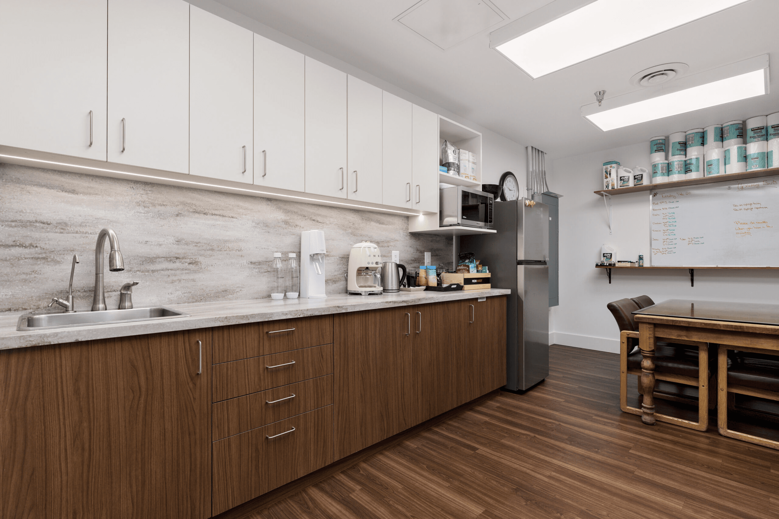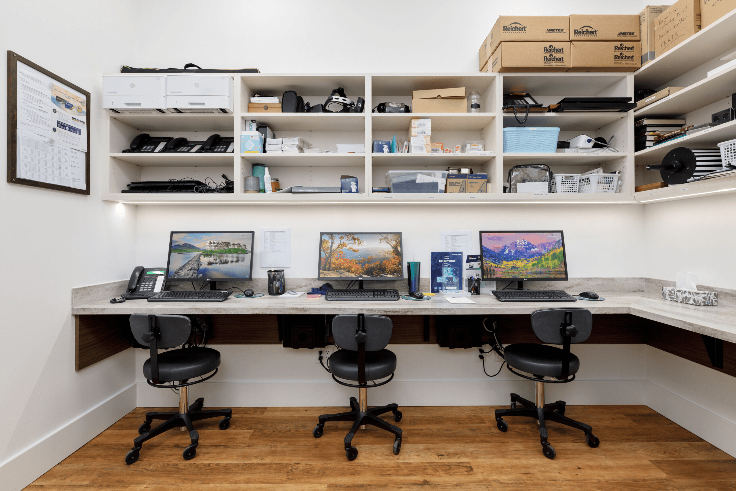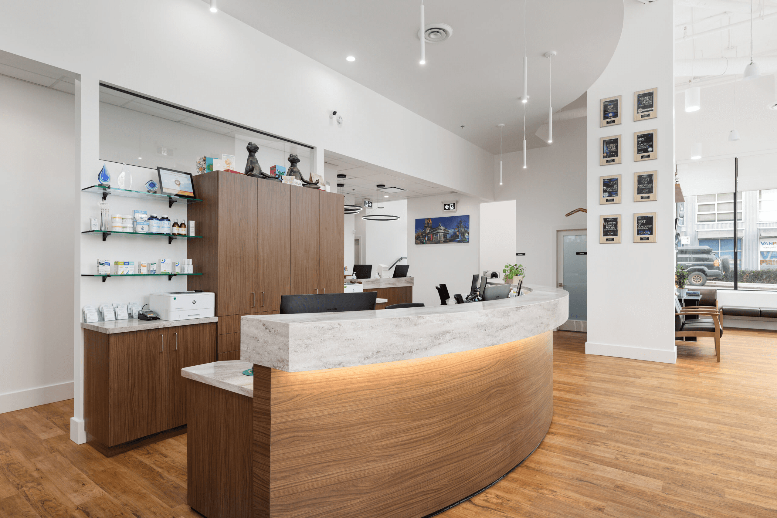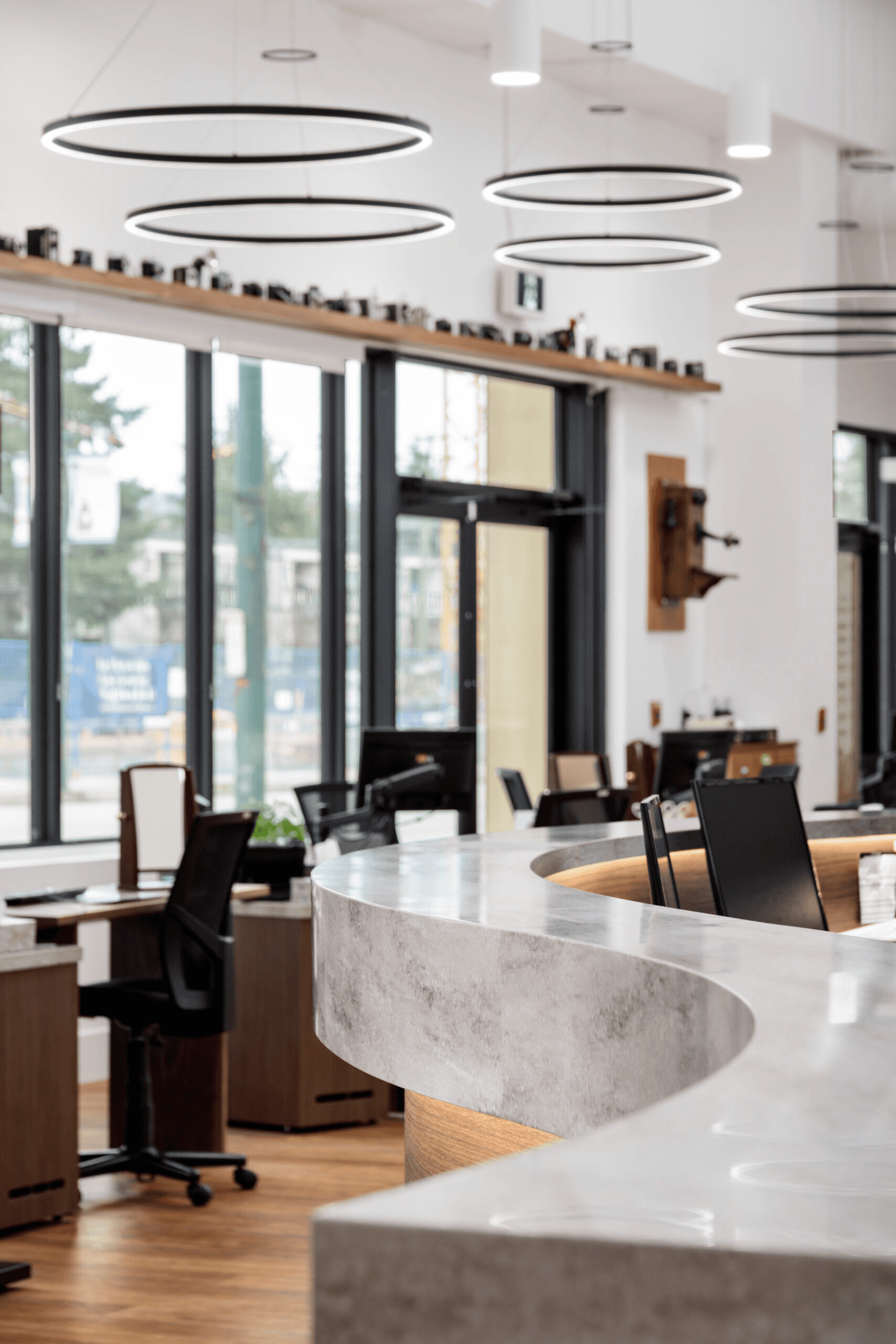 State-of-the-art eye care that’s modern and crisp without feeling cold. The retail eyewear display flows naturally into clinical examination space, creating a seamless patient journey from frame selection to comprehensive eye exam. Clean lines, strategic lighting, and a thoughtful color palette make both products and care stand out.